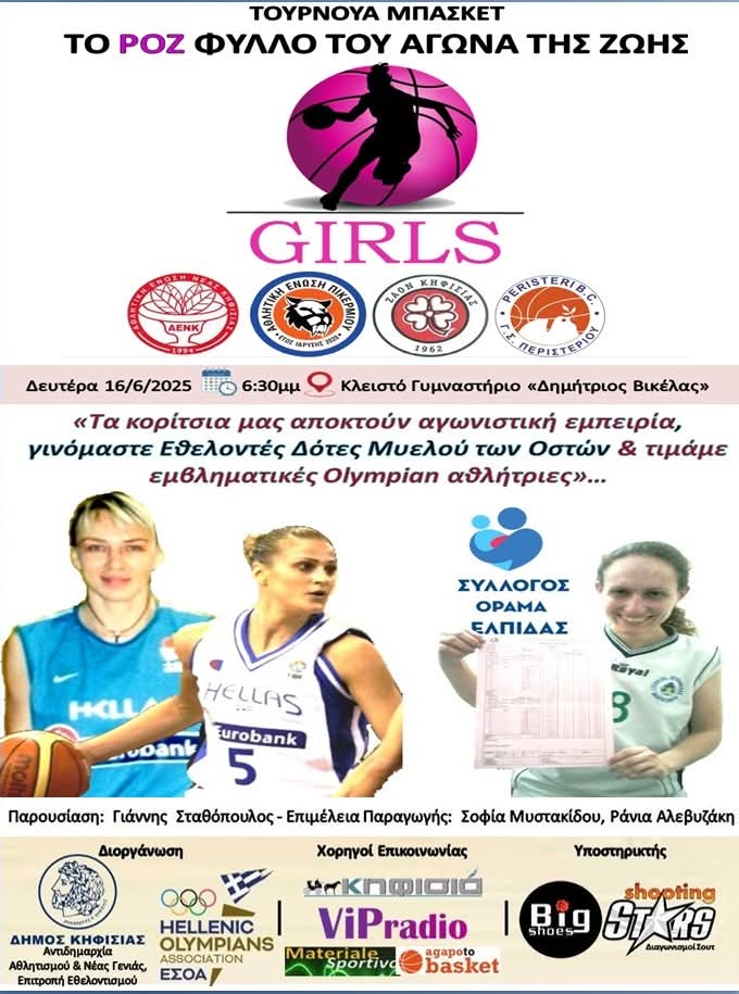 Το Τμήμα Αθλητισμού & Νέας Γενιάς και η Επιτροπή Εθελοντισμού του Δήμου Κηφισιάς υπό την αιγίδα της Ένωσης Συμμετασχόντων σε Ολυμπιακούς Αγώνες ΕΣΟΑ, διοργανώνουν Τουρνουά Μπάσκετ Κοριτσιών με την επωνυμία “ To Ροζ Φύλλο του Αγώνα της Ζωής”.