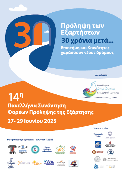 Το Πανελλήνιο Δίκτυο Φορέων Πρόληψης της Εξάρτησης με την υποστήριξη του Εθνικού Κέντρου Τεκμηρίωσης και Πληροφόρησης για τα Ναρκωτικά του ΕΠΙΨΥ και σε συνεργασία με Κέντρα Πρόληψης των Εξαρτήσεων και εθελοντικών φορέων από όλη την Ελλάδα διοργανώνουν στην Αθήνα από 27-29 Ιουνίου 2025 την 14η Πανελλήνια Συνάντηση Φορέων Πρόληψης της Εξάρτησης με κεντρικό μήνυμα «ΠΡΟΛΗΨΗ ΤΩΝ ΕΞΑΡΤΗΣΕΩΝ: 30 χρόνια μετά…Επιστήμη και Κοινότητες χαράσσουν νέους δρόμους».