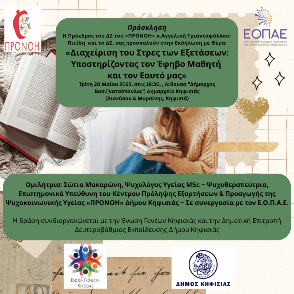 Με ιδιαίτερη χαρά σας προσκαλούμε στην εκδήλωση με τίτλο: «Διαχείριση του Στρες των Εξετάσεων: Υποστηρίζοντας τον Έφηβο Μαθητή και τον Εαυτό μας», που διοργανώνει το ΚΠ ΠΡΟΝΟΗ Δήμου Κηφισιάς σε συνεργασία με τον Ε.Ο.Π.Α.Ε. την Τρίτη 20 Μαΐου 2025, στις 18:30, στο Πολιτιστικό Κέντρο του Δήμου Κηφισιάς, Αίθουσα “Βασ. Γκασόπουλος” (Διονύσου & Μυρσίνης).