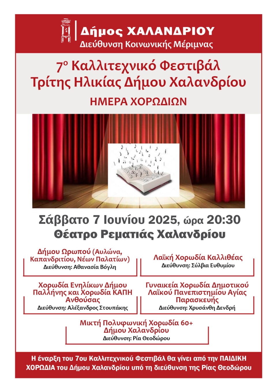 Το Πανελλήνιο Χορωδιακό Φεστιβάλ 60+ επιστέφει στο Ευριπίδειο Θέατρο Χαλανδρίου, το Σάββατο 7 Ιουνίου, στις 20.30, για 7η συνεχόμενη χρονιά.