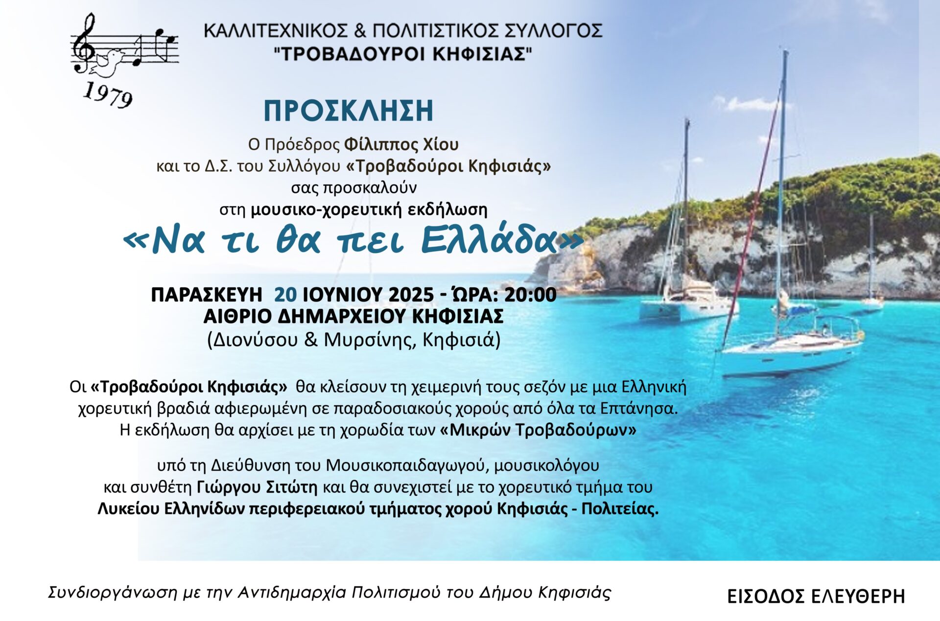 Ο Πρόεδρος Φίλιππος Χίου και το Δ.Σ. του Συλλόγου «Τροβαδούροι Κηφισιάς» σας προσκαλούν στη μουσικο-χορευτική εκδήλωση «Να τι θα πει Ελλάδα», που θα πραγματοποιηθεί την...