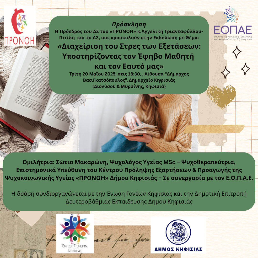 Με ιδιαίτερη χαρά σας προσκαλούμε στην εκδήλωση με τίτλο: «Διαχείριση του Στρες των Εξετάσεων: Υποστηρίζοντας τον Έφηβο Μαθητή και τον Εαυτό μας», που διοργανώνει το...