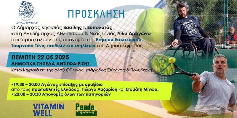 Ο Δήμαρχος Κηφισιάς Βασίλης Ι. Ξυπολυτάς και η Αντιδήμαρχος Αθλητισμού & Νέας Γενιάς Λίλα Δραγώνα σας προσκαλούν στις απονομές όλων των κατηγοριών του Ετήσιου Εσωτερικού...